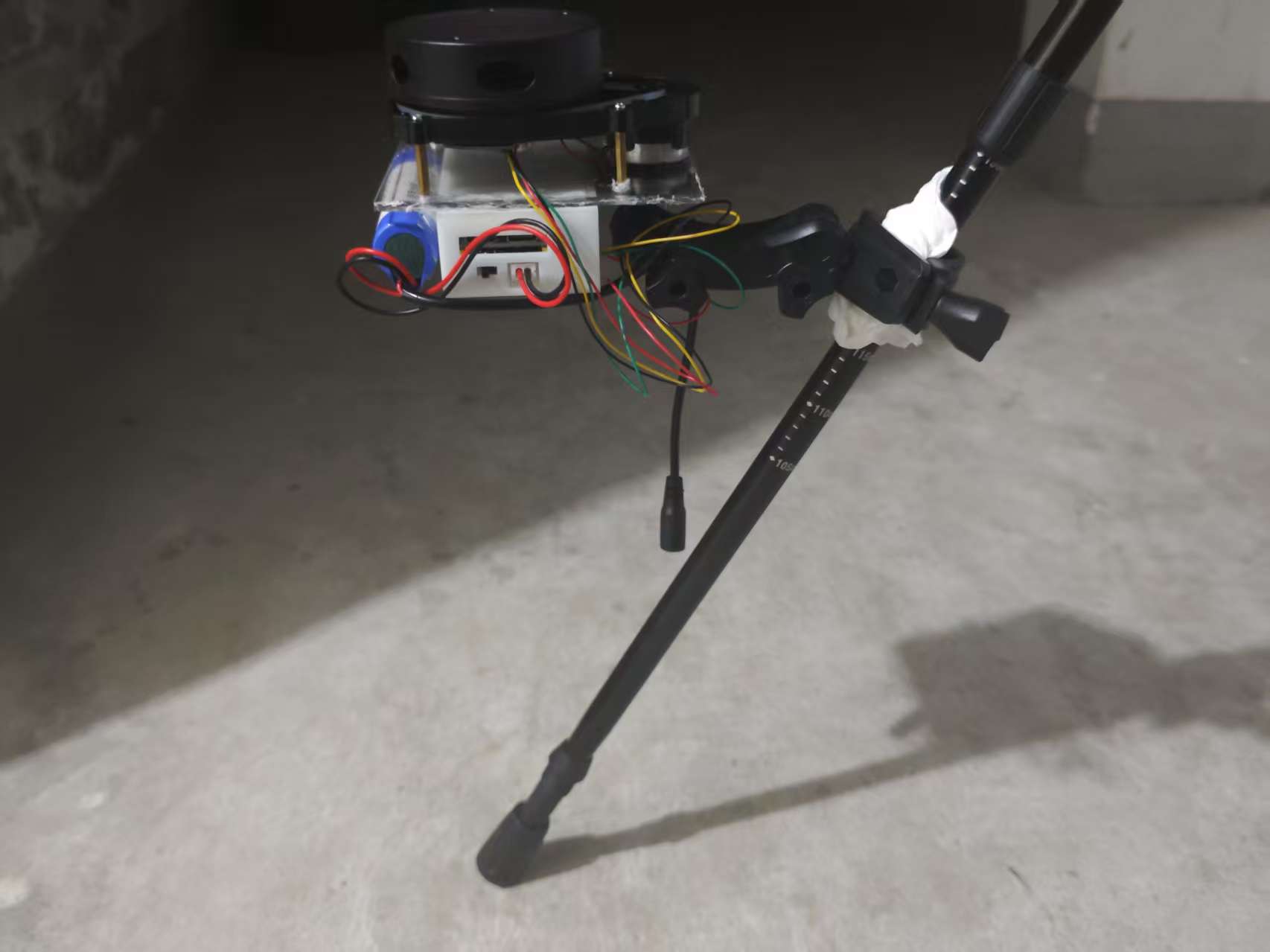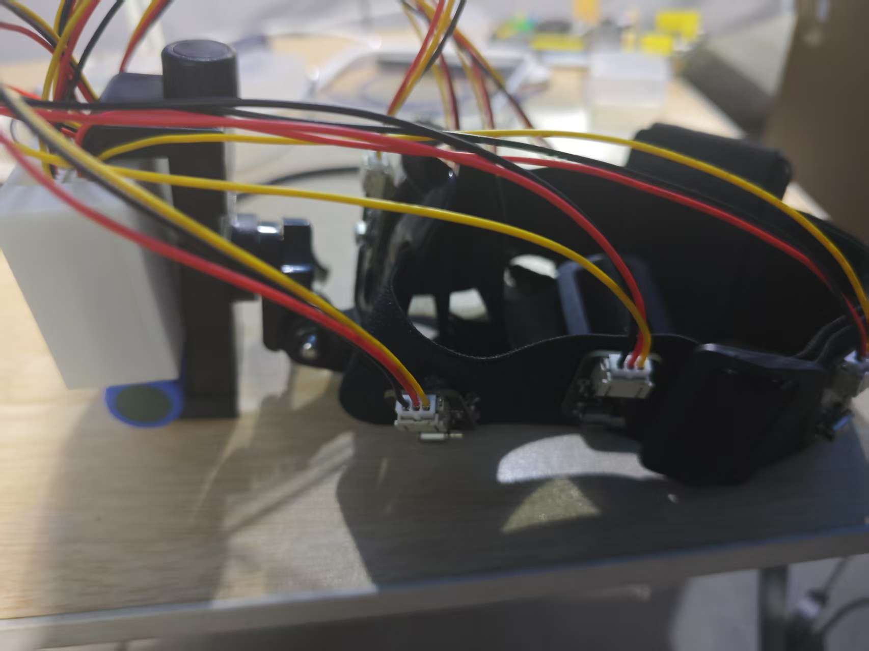 The cap is modified from a head mount for a camera. The vacant place for the action camera is used to fix the battery and the box of the mainboard. The motors connected by wires will be stuck on the head mount.